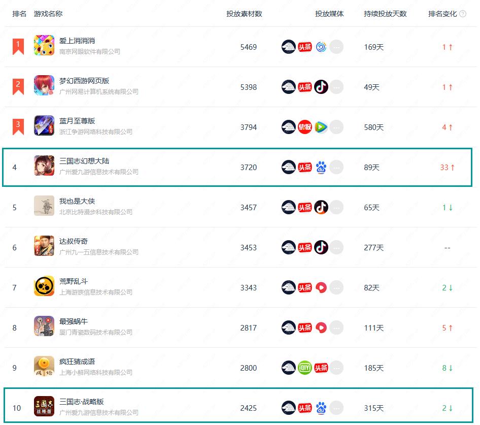 阿里游戏则是凭借《三国志·战略版》和新上线的《三国志幻想大陆》两款游戏扫荡买量市场。