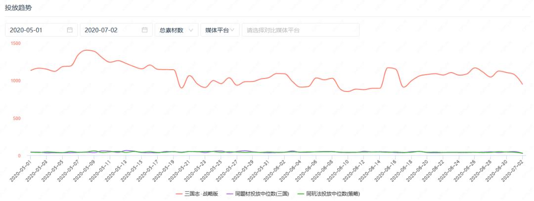 DataEye-ADX数据显示,从5月份至今,《三国志·战略版》每天投放的素材数基本保持在900组以上,远超同题材投放中位数。