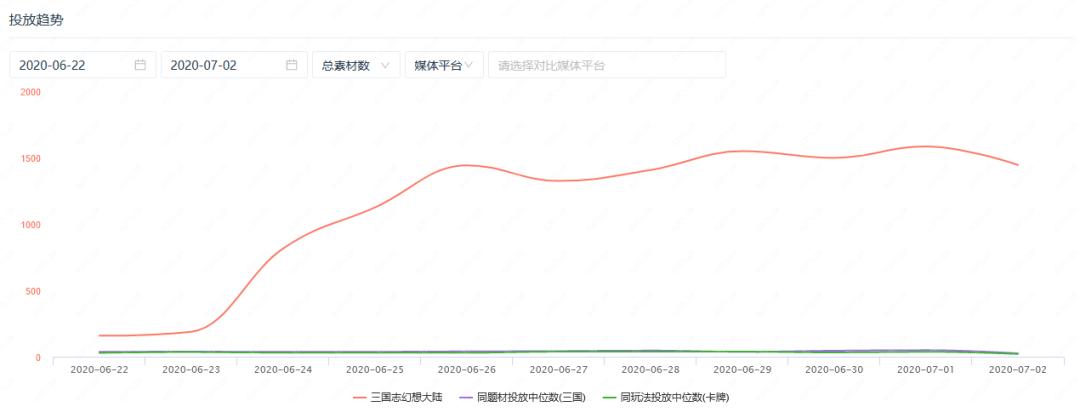 就在上个月底,阿里的新游《三国志幻想大陆》也开始了买量投放。这款三国题材的卡牌游戏自6月23日加大投放力度,从6月26日至今保持着日投放超1000组素材的规模,同样远超于同类型的其他产品。