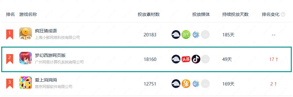 在近30天的买量产品排行榜中,《梦幻西游网页版》稳居TOP2,投放素材数达18160组。