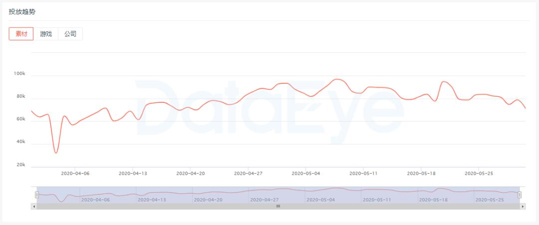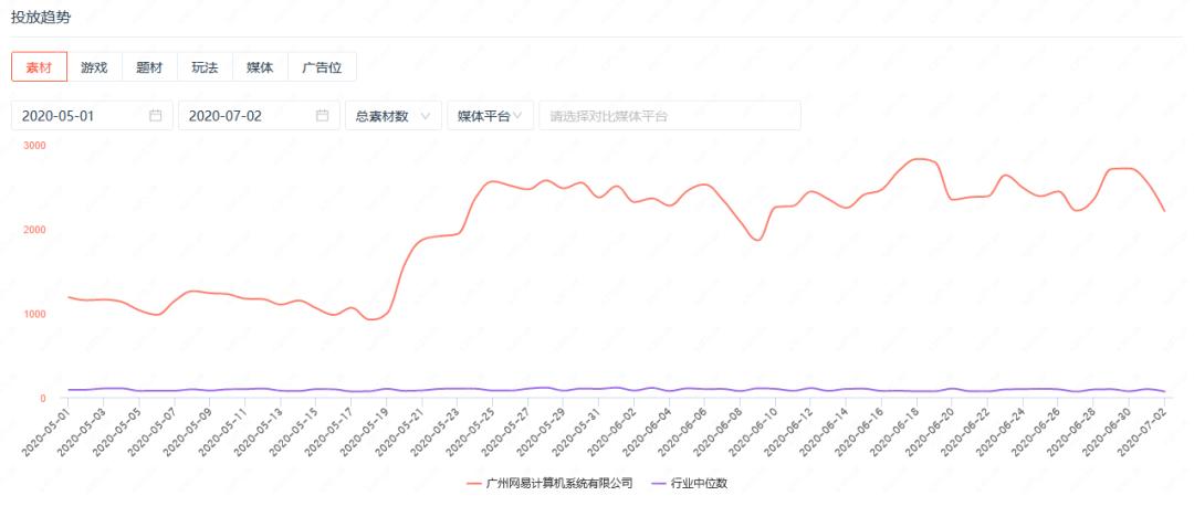 从投放素材数趋势来看,网易从5月中旬开始加大投放力度,目前每天投放的素材数基本保持在2000组以上。据了解,这也是网易今年开始的第一轮手游买量投放,可以说是处在“试水阶段”,但这一轮的投放量级已经达到两个亿了。