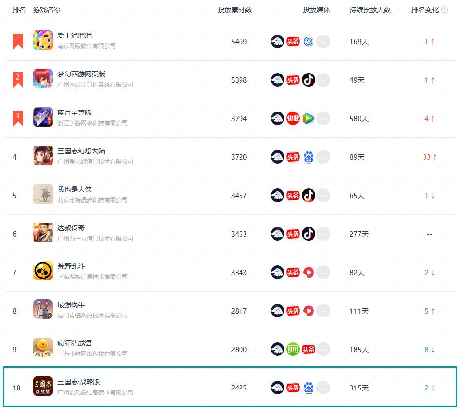 要知道,这款三国SLG手游早在去年9月份就正式上线了。在游戏已经上线快半年的情况下,仍能保持每天大规模的素材投放,这样的打法即使放在大厂行列也并不多见。在近30天的买量产品榜中,《三国志·战略版》位列第11位;而在近7天的排名里,这款产品甚至保持在TOP10以内。