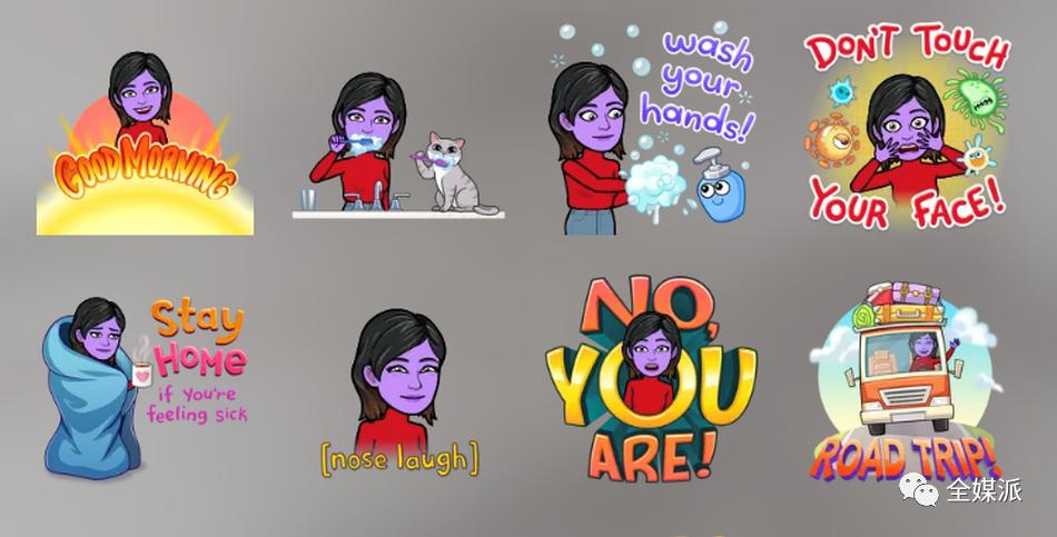 这些贴纸的画风呈现出经典的Bitmoji风格,象征用户的小人站在提示信息的中心,还长着一张紫色的脸。带着泡泡、动漫肥皂和卡通细菌的贴纸传播了可以有效防御病毒传播的几种方法。