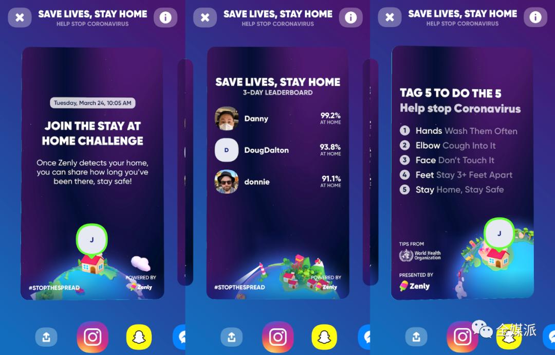 Snapchat旗下的的定位分享应用Zenly推出了一个游戏,对用户在家的时长进行排名,鼓励用户宅在家里,有效保持社交距离。Zenly以往都会鼓励用户分享他们的社交位置信息,比如与朋友会面的地点等,但是在当下,约朋友出门逛街的行为不利于疫情防控。在这样的背景下,Zenly改变了运营思路,推出了全新的“宅家排行榜”,展示用户及好友没有外出的时长。