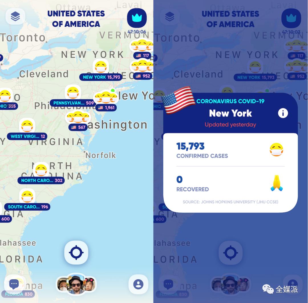 Zenly同样提供了一份叠加贴纸的地图,可以清晰地显示某个州或地区的新冠病毒感染人数。用户点击这些emoji时,就会显示出确诊病例数和恢复人数。