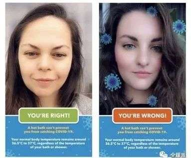 Snapchat于3月推出了一款名为“破解Covid-19谣言”(Covid-19 Myth Busting)的游戏,这是一款能在自拍界面显示交互滤镜的益智问答游戏。游戏中的问题和答案来源于世界卫生组织(WHO)的信息。