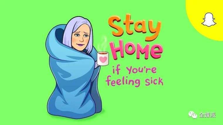 随着美国疫情的升级,Snapchat于三月中旬推出了以健康为主题的贴纸。这些贴纸以一种轻松愉快的方式向用户建议:勤洗手,少出门,不要用手摸脸。