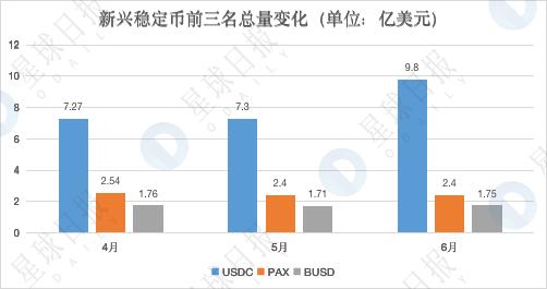 值得一提是,除 USDT 外的新兴稳定币排名也发生变化。上季度末,HUSD 排名第四,本季度则被 TUSD 取代,不过前三名始终是 USDC、PAX 以及 BUSD,各月份总量变化情况如下所示:
