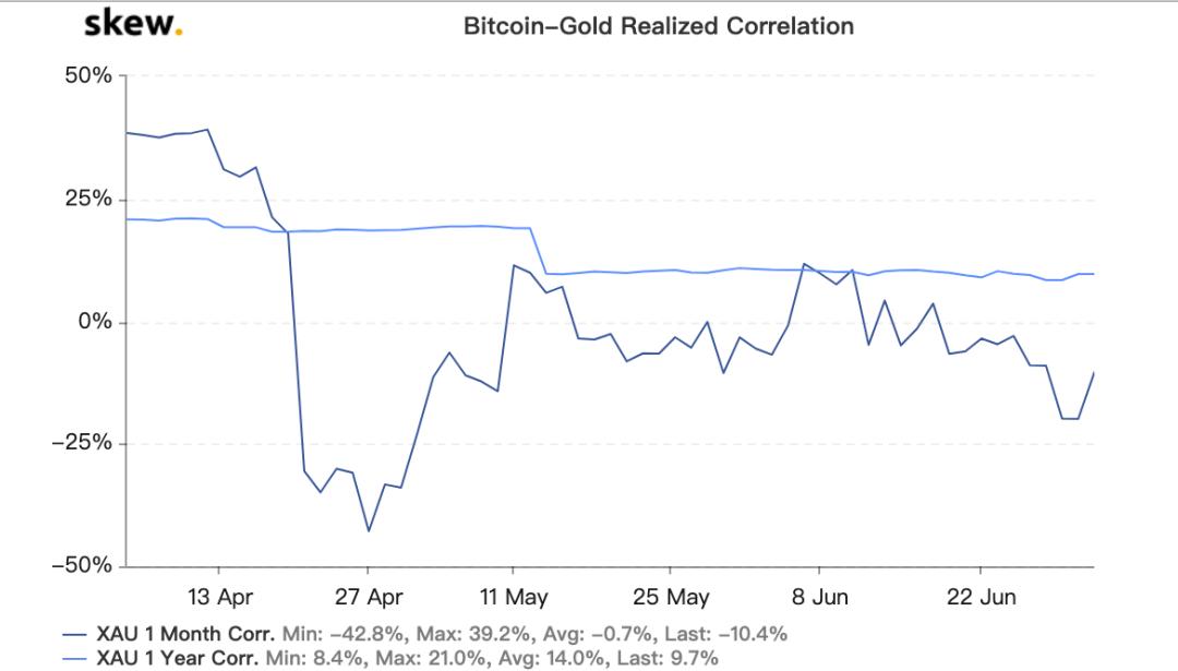 Skew 数据显示,在 4 月 28 日比特币大涨前,比特币与黄金月度相关性为负数,呈负相关且程度较低;之后,相关性系数上涨,偶有穿过零轴(正相关),但大多数时候仍然位于零轴以下,呈弱相关。如下所示: