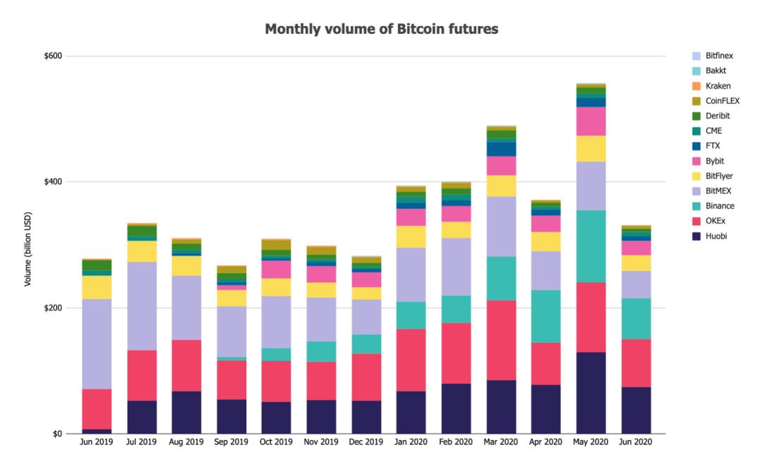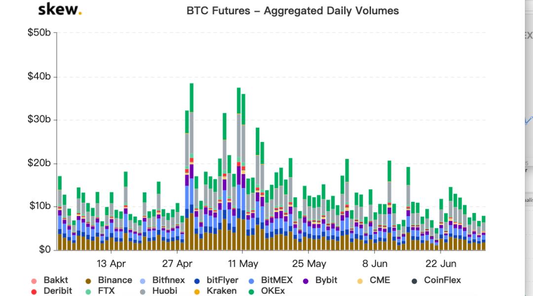 从上图也可以看出,期货交易量飙升主要集中在比特币减半(5 月 12 日)前后,维持了近一个月;从 6 月开始,比特币期货交易量开始走低,特别是 6 月 21 日交易量一度降至 50.28 亿美元,创下 2020 年新低。