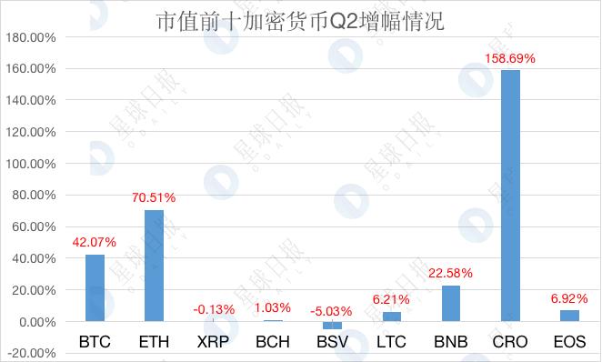 BitUniverse 数据显示,市值前十的币种中,2020 年 Q2 价格增幅前三的币种分别是:CRO(+158.69%)、ETH(+70.51%)、BTC(+42.07%);下跌的分别是:BSV(-5.03%)和 XRP(-0.13%)。如下所示: