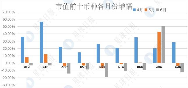 最后,具体到单个月份,各币种表现不同。四月份 ETH 表现最强劲,增幅最高达到 56.75%;五月份以及六月份的震荡行情中,CRO 表现最为亮眼,始终处于上涨态势,涨幅分别是 42.61%、50.41%。如下所示: