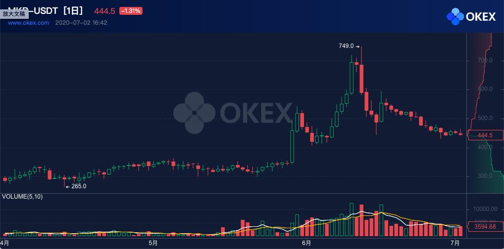 (注:MKR 价格Q2变化,图片来自 OKEx)