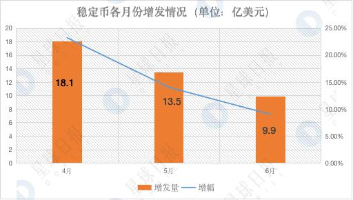 从具体月份来看,USDT 增发量逐月下降:4 月增发 17.6 亿美元,增幅 28.12%;5 月增发 13.4 亿美元,增幅 16.71%;6 月增发 7.5 亿美元,增幅 8%。如下所示: