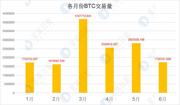 Bitcoinity.org 数据显示,二季度比特币交易总量达到 711 万个,环比下降 5.3%;具体到单月,5 月交易量最多,6 月最少。如下所示: