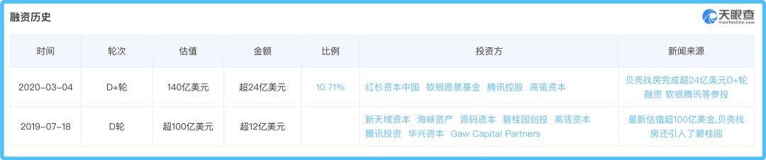 公开资料几乎查不到其早期融资情况,贝壳找房首次公开的融资从D轮开始。2019年3月25日,贝壳找房官宣启动D轮融资,并透露已经获得由战略投资方腾讯领投的8亿美元。