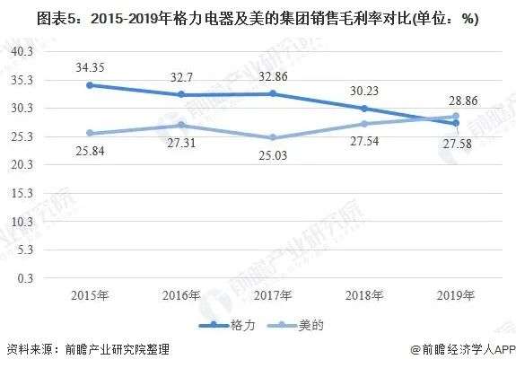 毛利率是衡量一家企业业务盈利能力的核心指标。2015年,美的再次在营收额和净利润方面超越格力。据格力年报数据显示,其营业收入为977.45亿元,同比下滑29.04%;净利润为125.32亿元,同比下滑11.46%。营收和净利润双双下滑,这是格力上市20年来首次出现的情况。