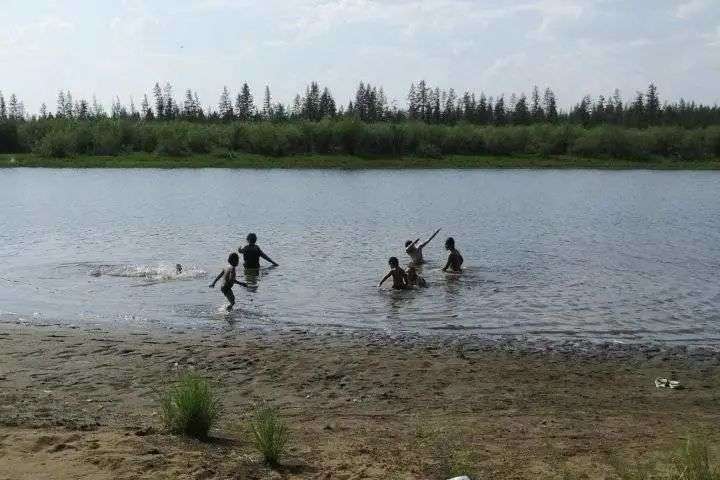在维尔霍扬斯克的湖中玩耍的小孩. 图片来自:Associated Press