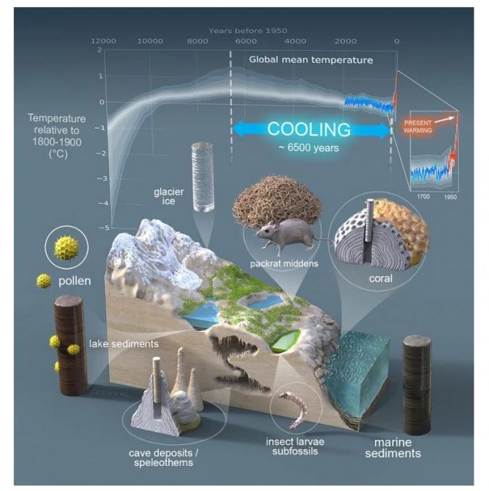 北亚利桑那大学一个研究团队重建了古代气候的模型,分析出距今 12000 年前古气候数据记录,发现从 6500 年前开始,地球一直在缓慢地降温,直到 19 世纪中叶气温开始急剧上升,迅速超过了 6500 年前的峰值。