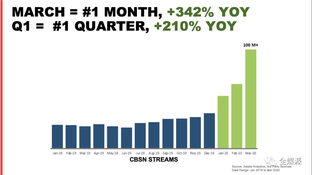 CBS News Digital的执行副总裁兼总经理Christy Tanner认为:与疫情进展和政策等相关的每日突发新闻带动了3月前几周的观看量提升。