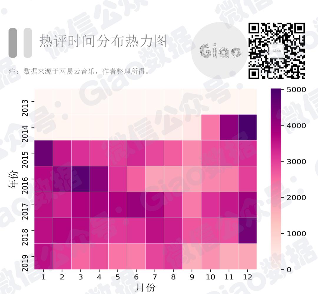此外,网易云音乐也在2015-2018年进入了用户扩张期,这也可能是这几年内热评分布较为分散的成因之一,而2019年分布又相对扁平化了,
