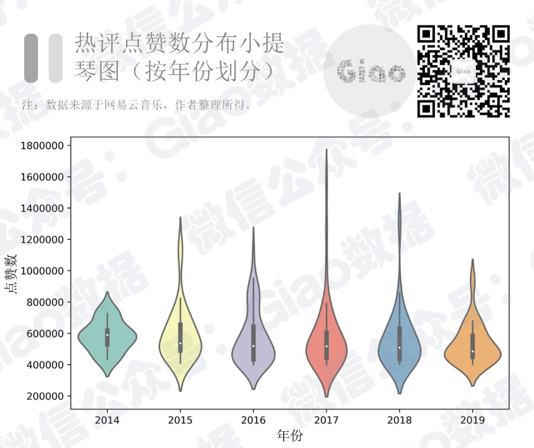 2013和2014年是网易上线的前两年[6],用户数量还没有起来,因此可能点赞数较高的热评总体上而言也较少。