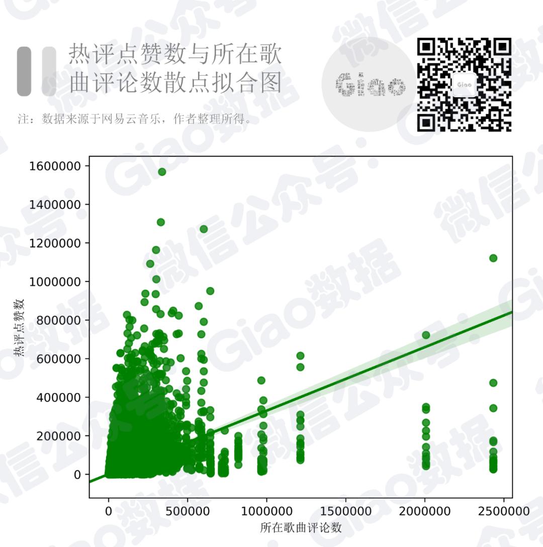 如下图散点拟合图所示:热评点赞数与所在歌曲评论数呈正相关关系,即在平均意义上而言,所在歌曲热度越高,热评获得的点赞数也越高,这是由于歌曲热度带来的流量会增加评论的曝光度,进而增加评论被点赞的几率。
