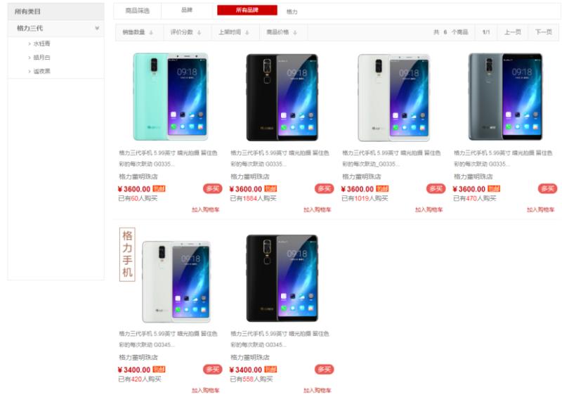 目前在格力商城上,仅格力三代在售,颜色有青、白、黑三色可选,最低售价3400元。根据其显示的购买人数,粗略估计格力三代最低销售了6783台。