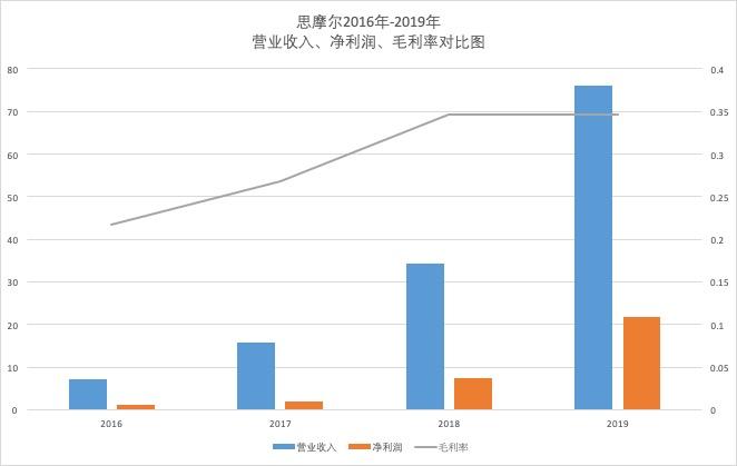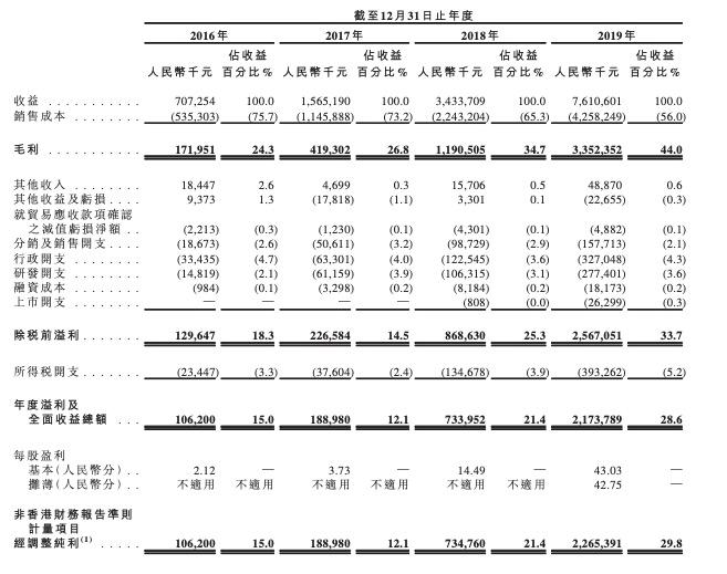 净利润上分别为1.06亿元、1.89亿元、7.34亿元和21.74亿元,复合年增长率为173.5%;毛利率上也在逐年走高,分别为24.3%、26.8%、34.7%和44%。