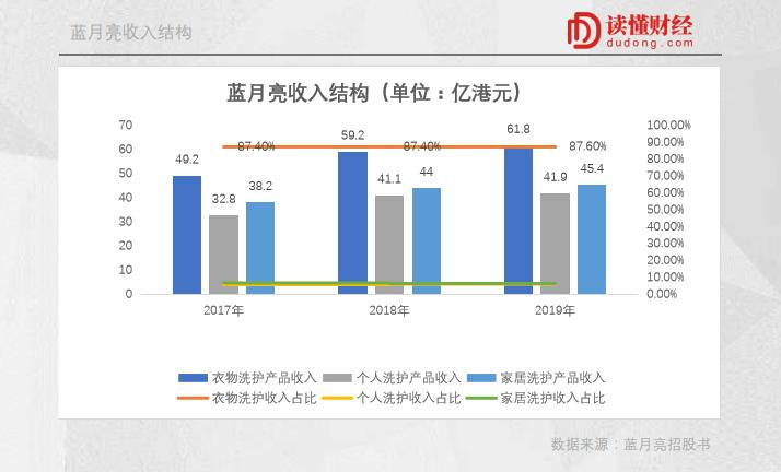 蓝月亮的收入来自衣物清洁护理、个人清洁护理、家居清洁护理的三大业务板块。