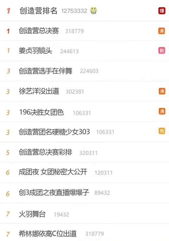 这也符合当下舆论场的热度反馈,在硬糖少女303成团夜当天,相关话题包揽了各平台的热搜,包括“创造营决赛”“创造营团名硬糖少女303”“希林娜依高C位出道”等等。
