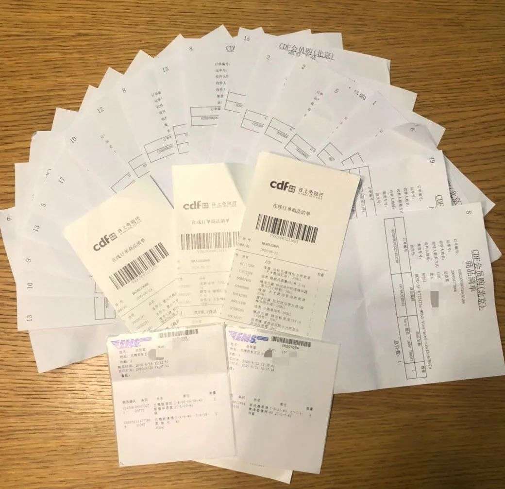 棕黄色桌面,一沓商品清单像孔雀开屏一样罗列,最上面几张购物小票清晰地显示着一行加粗字体:「cdF 日上免税行 在线订单商品清单」。
