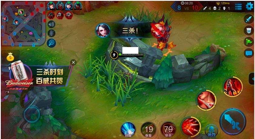在王者荣耀三杀、五杀等主播操作的高光时刻,以及英雄回血等非精彩时刻,企鹅电竞的直播画面上都曾弹出过相关广告,整体设计非常符合当下直播的游戏场景。