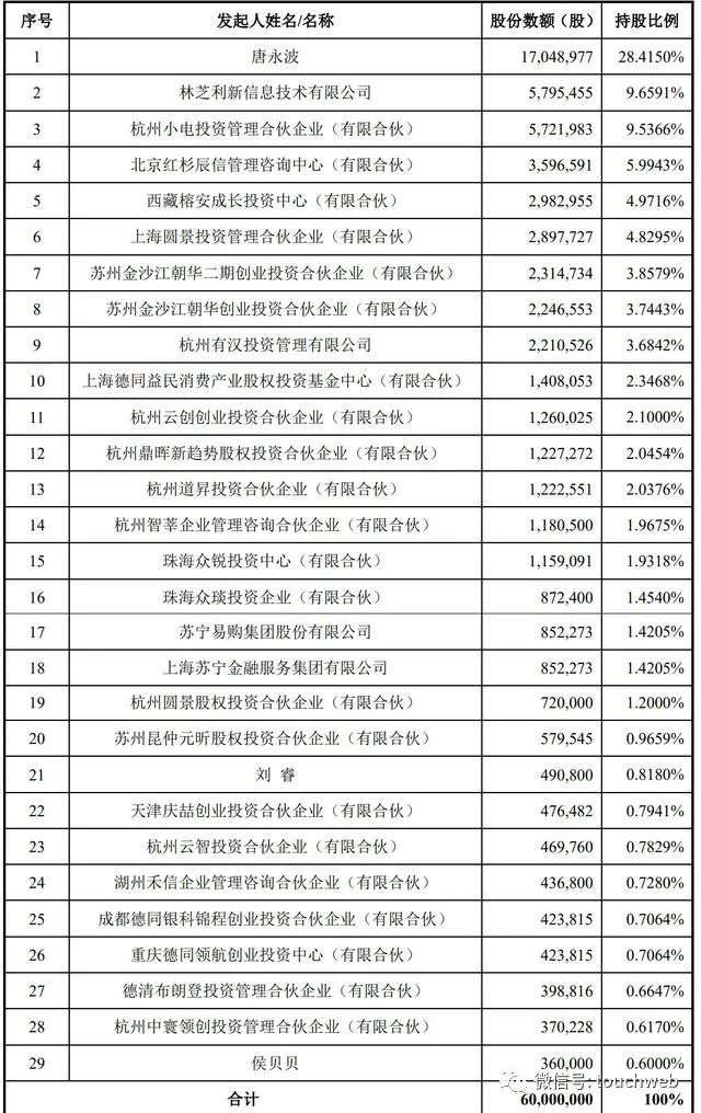 上海德同益民消费产业股权投资基金中心(有限合伙)持股为2.3468% ,杭州云创创业投资合伙企业(有限合伙)持股为2.1000%;杭州鼎晖新趋势股权投资合伙企业(有限合伙)持股为2.0454%;杭州道昇投资合伙企业(有限合伙)持股为2.0376%。