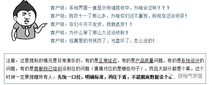 如果有就是物流执行没到位,转物流处理;如果没有,就得靠客服努力,或者安抚客户,或者向客户解释原则。这样大家都能在有限的成本内,最大化解决问题。