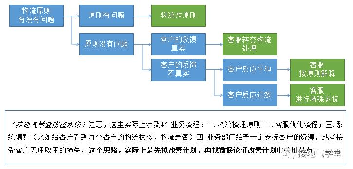 所以站在解决问题的角度,第一步并非建立客户满意度指标,而是先定义物流的服务原则,比如最长发货时间是多久,比如发货破损率控制在多少,等等。有了这个标准,第二步就能推动客服,在应对客户投诉的时候,先区分有没有违背服务原则。