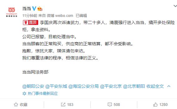 7月7日早间,当当网官方微博发布公告称,李国庆再次诉诸武力,带二十多人,清晨强行进入当当,撬开多处保险柜,拿走资料。公司已报警,目前处理当中。