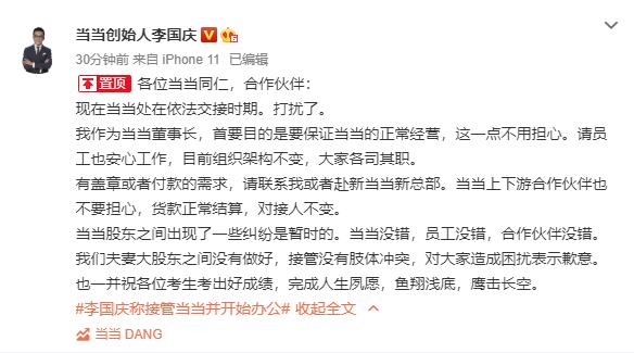 截至发稿前,李国庆在12点22分通过微博发布最新动态:现在当当处在依法交接时期,目前组织架构不变,大家各司其职。有盖章或者付款的需求,请联系我或者赴新当当筹备总部。当当上下游合作伙伴也不要担心,货款正常结算,对接人不变。当当股东之间出现了一些纠纷是暂时的。祝愿各位考生考出好成绩,完成人生夙愿。