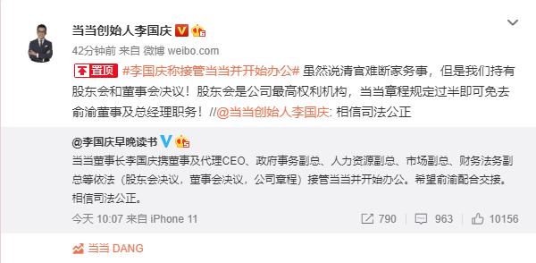 李国庆早晚读书官方微博发文称,当当董事长李国庆携董事及代理CEO、政府事务副总、人力资源副总、市场副总、财务法务副总等依法(股东会决议,董事会决议,公司章程)接管当当并开始办公。希望俞渝配合交接。相信司法公正。李国庆个人微博也转发了上述内容。