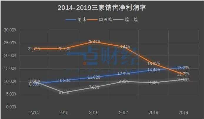 同时,2017年开始,周黑鸭的销售净利润率快速下滑,而绝味一路上涨,并在2019年被超过。数据显示,2019年周黑鸭销售净利润率下滑至12.79%,绝味则为15.29%。