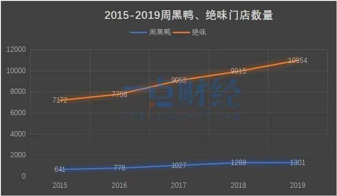 与之相比,周黑鸭近些年的门店扩张就过于保守,四年间仅增加了660家门店,甚至不到绝味一年的门店增长数量。2019年,其门店为1301家,绝味10954家,是它的8.42倍。
