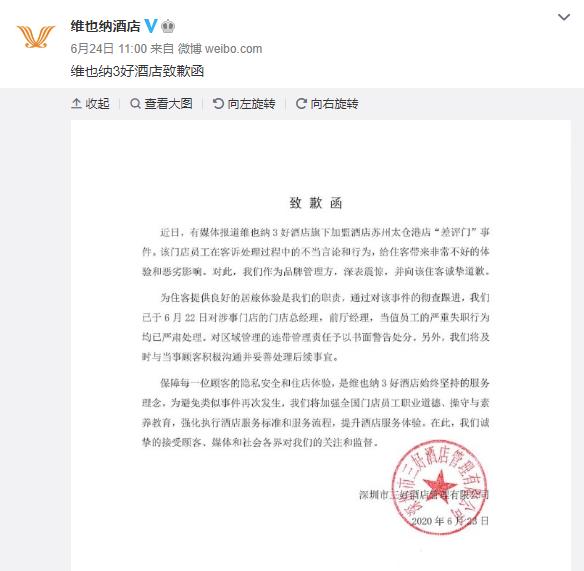随后事件在网络上不断发酵,被爆料的维也纳酒店官方也紧急发声回应,通过微博在6月24日对该事件发出致歉函,表示是该酒店门店员工在客诉处理过程中的不当言论和行为,给住客带来非常恶劣的影响。维也纳酒店已经于6月22日对涉事门店的门店总经理、前厅经理和当值员工的严重失职行为严肃处理,对区域管理的连带管理责任予以书面警告处分。