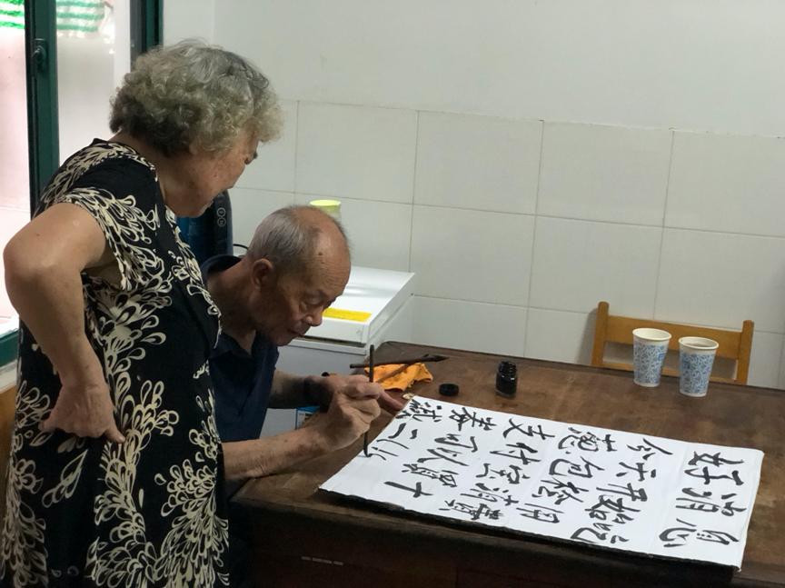 孙奶奶的老伴儿今年85岁,一大早找来毛笔和墨水,要把这个好消息写上纸板,挂在门口。“要先写「好消息」,今天开始吃葱包桧,用支付宝消费券,可以买十减二”,孙奶奶来回琢磨好几遍,才让老伴下笔。