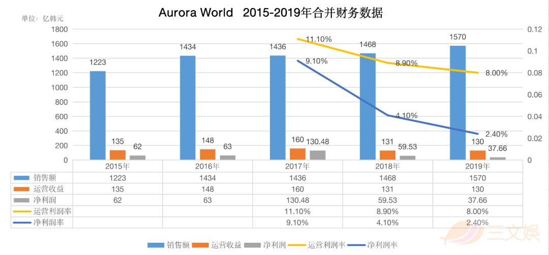 据公司2015年至2019年的合并财务数据显示,五年来,Aurora Word的销售额一直呈在逐年增加,但运营收益以及净利润却在2018年和2019年连续下降。2019年,其销售额达到了9.24亿元,净利润0.22亿元。