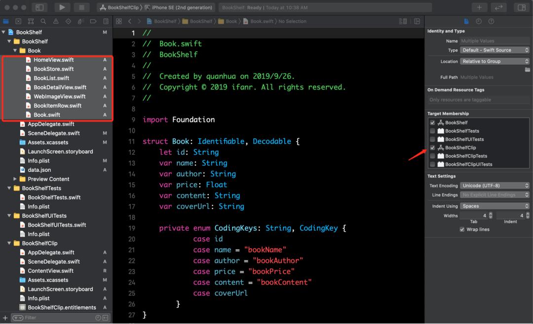 HomeView 从哪里来的呢?这就是 App Clip 开发上的便利:可以不写代码。通过和原始 Target: BookShelf 共享文件,BookShelfClip 可以直接使用 BookShelf 中已经写好的 HomeView,如下图: