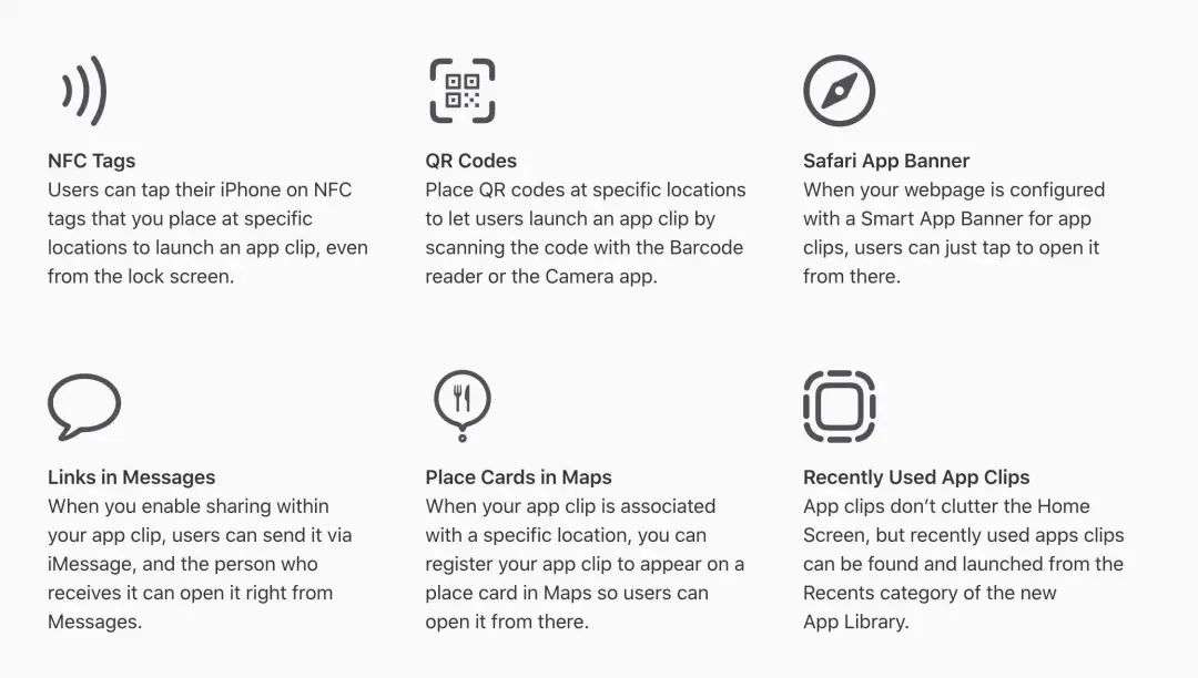 从技术发展角度来看,App Clips 就是 iMessage app 的升级版本。它在聊天窗口发送能力的基础之上,增加了 NFC 近场打开、扫码打开、网页关联打开、地图 POI 打开等服务发现路径,基本上涵盖了实际生活中所有需要服务的场景。