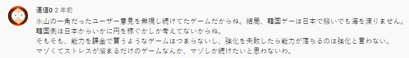 自由度低的问题,再后来也成为过渡追求付费和数值强度的衬托,放大了玩家的负面体验:“这游戏毕竟一直无视着冰山一角的玩家意见。到头来韩国游戏在日本再怎么火也没法漂洋过海。韩国只想着在日本挣钱。再说了,用钱买能力值的游戏本身就无聊,强化失败了还能减能力值,这根本就称不上强化。像这样只能自找苦吃积累压力的游戏,大概只有受虐狂才玩的下去。”