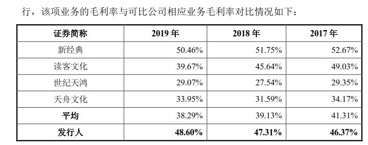 与大众印象中做图书出版生意清贫不同,果麦文化的毛利率在行业中处于较高水平。招股书资料显示,2017年、2018年和2019年果麦文化的毛利率分别为46.37%、47.31%和48.6%,略高于天舟文化、读客文化和世纪天鸿等同类企业。