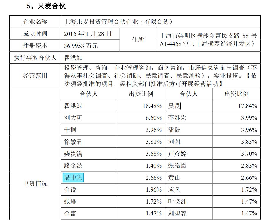 此外路金波还通过果麦合伙间接持有公司少量股份。这个果麦合伙更像是果麦文化的核心员工持股平台,路金波将与公司深度绑定的作家、员工持股都统一安排在这个公司名下。比如易中天就持有果麦合伙2.66%的股份,折合成果麦文化的股权比例约为0.19%;《我与世界只差一个你》作者张皓宸持有果麦文化2.83%,折合成果麦文化的股权比例约为0.2%。