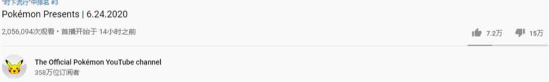 拿上个月末宝可梦与腾讯(天美)合作开发的团队对战游戏《宝可梦大集结》公布视频来看,宝可梦官方的英文YouTube频道中的“Pokemon Presents”新作发表会获得了网友的7.2万个赞,踩则收到了15万个,数量几乎是赞的翻番。